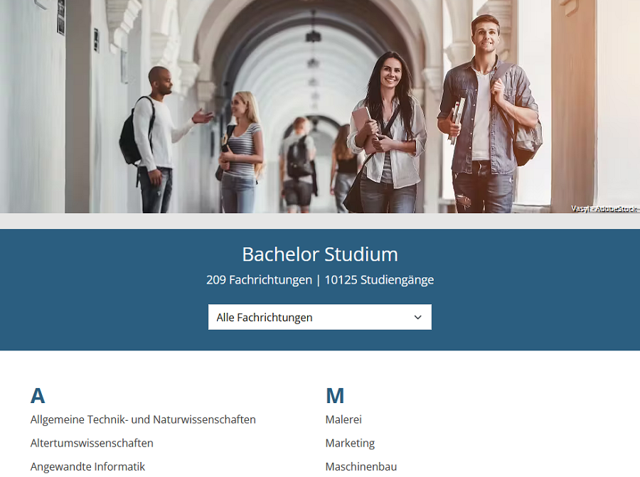 Interessierst du dich bereits für eine spezielle Fachrichtung, erhältst du ebenfalls im Bachelor-Bereich per Mausklick sofort Informationen zu Aufbau und Inhalt des Studiums. Zusätzlich werden alle Studiengänge aufgelistet, die in der gewählten Fachrichtung zur Auswahl stehen - detaillierte Informationen zum gewünschten Studiengang sind nur einen Klick entfernt. Findest du hingegen einen gewissen Fachrichtungsbereich besonders spannend, z.B. Technik oder Kunst, hast aber noch keine genaue Vorstellung davon, welches Studium dich in diesem Bereich interessieren könnte, kannst du dir auf dieser Seite ganz leicht einen Überblick darüber verschaffen, welche Studiengänge in den jeweiligen Fachrichtungsbereichen angeboten werden. Möchtest du dich ganz allgemein über das Angebot an Bachelor-Studiengängen informieren, ist der Bereich Bachelor ebenfalls ideal.