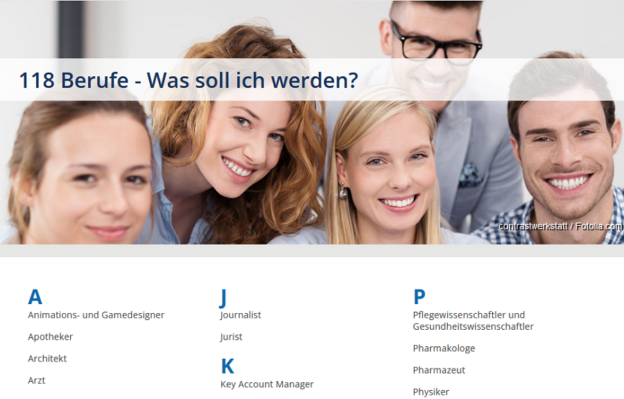 Bist du vielleicht noch komplett ahnungslos, was deinen späteren Beruf anbelangt und auf der Suche nach Ideen? Wir bieten dir umfassende und konkrete Informationen zu den beruflichen Aussichten, die dir nach einem Studium offen stehen. In unserem Bereich Berufe haben wir zahlreiche Berufsbilder versammelt: Von A wie Animations- und Gamedesigner/in bis Z wie Zoologe/-in ist alles dabei.