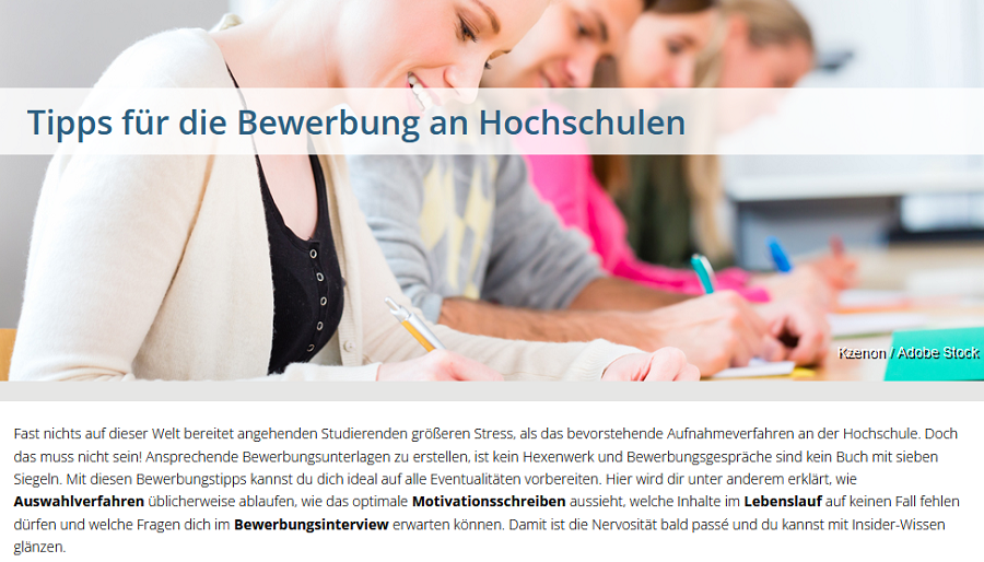 Gibt es an deiner Hochschule ein Aufnahmeverfahren? Benötigst du dazu Tipps? Unter Bewerbungstipps erfährst du, wie die verschiedenen Auswahlverfahren an Hochschulen aufgebaut sind und wie du dich optimal darauf vorbereiten kannst, um die Anforderungen zu erfüllen. Im Bereich Berufe siehst du, welche beruflichen Optionen sich dir nach der Absolvierung eines Studiums bieten können. Du weißt genau, was du werden möchtest, aber nicht, welches Studium für dich in Frage kommt? Wir bieten dir umfangreiche Informationen zum gewünschten Berufsfeld und listen all die Studiengänge auf, die dich zur Ausübung deines Traumjobs befähigen.